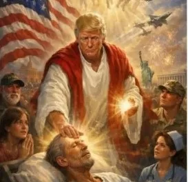 Na imagem, Trump aparece com vestes claras e expressão serena, lembrando representações tradicionais de Jesus Cristo. Ao redor, é possível ver também a bandeira dos Estados Unidos, uma águia, que é símbolo do país, e a Estátua da Liberdade. Há ainda a presença de militares, caças e uma enfermeira, o que chamou atenção por misturar religião com patriotismo.